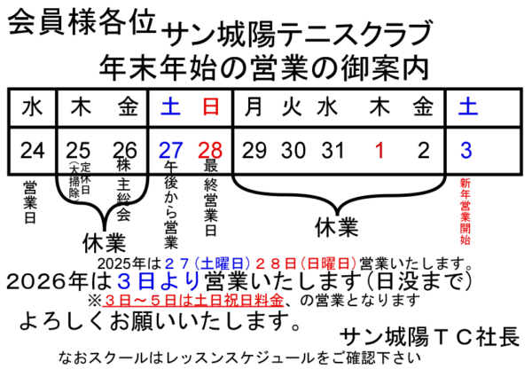 サン城陽テニスクラブ年末年始営業のご案内